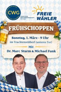 Die CWG Pöttmes lädt am Sonntag, 1. März 2026, ab 9 Uhr zum politischen Frühschoppen in das Heimat- und Volkstrachtenvereinsstüberl (Unterer Torbogen) ein. Als Gäste werden Landratskandidat Dr. Marc Sturm und Bürgermeisterkandidat Michael Funk erwartet, die ihre Ziele vorstellen und für den persönlichen Austausch bereitstehen.