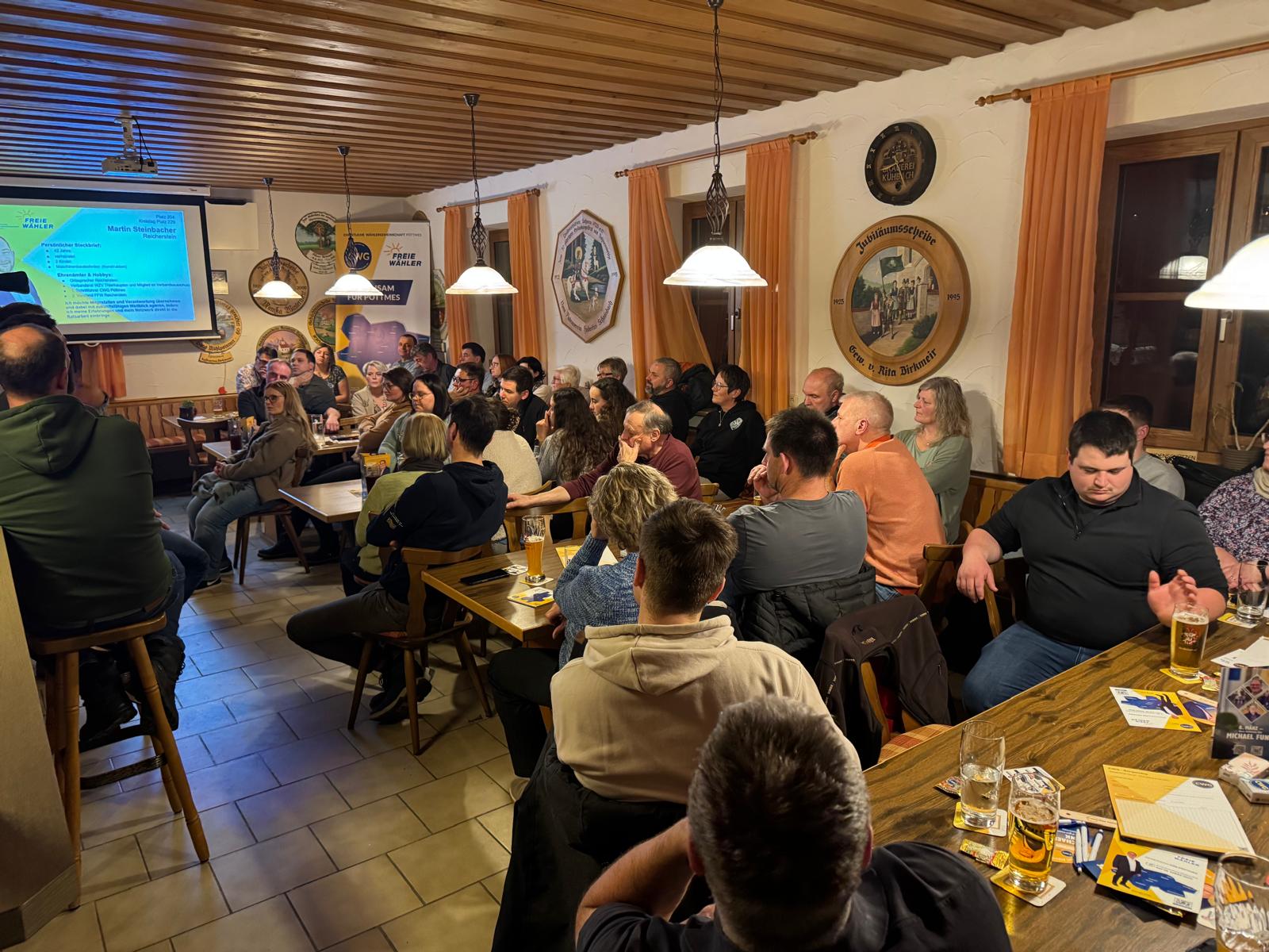 Das Schützenheim der Lindenschützen Schorn füllte sich rasch. Die Einleitung in den Abend übernahm Benjamin Geßmann, der die Gäste begrüßte und den Ablauf der Veranstaltung vorstellte. Anschließend führte Manfred Riedelsberger die Anwesenden strukturiert durch das Wahlprogramm und erläuterte die zentralen Themen und Ziele der CWG.